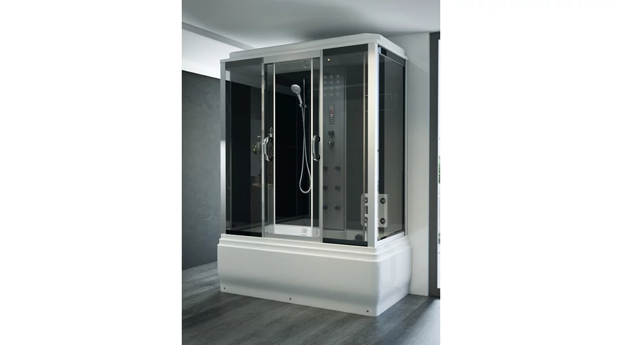 Kádas hidromasszázs kabin elektronikával 170x85x220cm Üvegszál erősítéses, acél merevítésű, fehér színű akril kád, állítható fém lábakkal. Beépített ülőkével. Kádtöltő. Túlfolyó. Leeresztő szelep Matt króm alumínium vezetősínek és profilok. 5 mm vastag, sötétített biztonsági üvegek és ajtók. Fekete üveg hátfalak. Matt króm színű funkciós panel. 6 db hidromasszázs fúvóka. Rádió. Felső világítás. LED háttér világítás. Ventilátor. Vezetékes telefon csatlakozási lehetőség. Kézi zuhany. Felső esőztető zuhany. Kerámia betétes keverőszelep és funkcióváltó. Lábmasszázs. Piperepolc. Törölköző tartó rúd. Mágneses ajtózár. Görgős ajtónyitás.