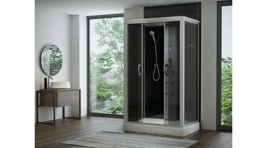 Szögletes hidromasszázs zuhanykabin elektronikával 120x80x222 cm Üvegszál erősítéses, acél merevítésű, fehér színű, alacsony, akril zuhanytálca, állítható fém lábakkal. Matt króm alumínium profilok. 5 mm vastag, sötétített biztonsági üvegek és ajtók. Fekete üveg hátfalak. Matt króm funkciós panel. 6 db hidromasszázs fúvóka. Érintőképernyős kijelző. Rádió. Felső világítás. LED háttérvilágítás. Ventilátor. Kézi zuhany. Felső esőztető zuhany. Kerámia betétes keverőszelep és funkcióváltó. Piperepolc. Mágneses ajtózár. Görgős ajtónyitás. Leeresztő szelep.